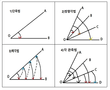 - 1)교각법: 어떤 측선이 그 앞의 측선과 이루는 각을 관측하는 방법으로 요구하는 정확도에 따라 단측법, 배각법으로 관측할 수 있다.