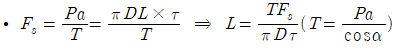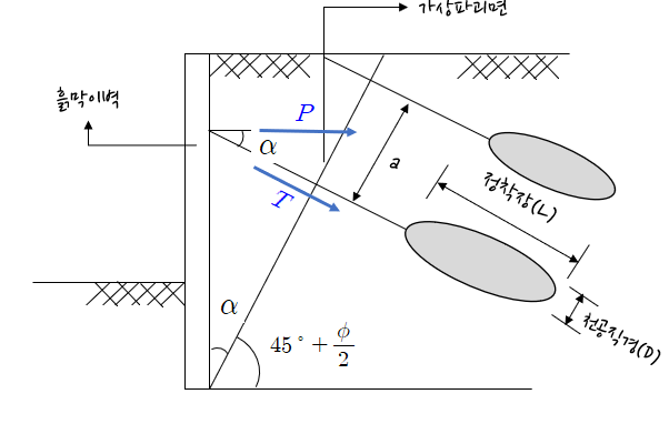 여기서, P: 앵커반력, a: 앵커설치간격, T: 앵커축력, D: 천공직경, L: 정착장, tau: 정착부의 주면마찰저항, alpha: 설치각도
