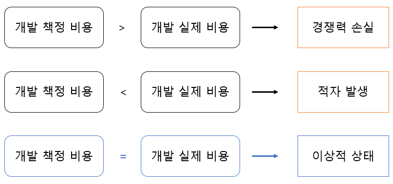 : 예산 책정 시 무조건 비용을 적게 들이는 것이 좋은 것은 아니다. 예를 들어 기업에서 제품을 개발한다고 할 때, 개발 채정 비용을 실젭다 높게 책정하면 경쟁력을 잃어버리게 되고, 반대로 낮게 책정하면 개발 자체가 이익을 주는 것이 아니라 오히려 적자가 나는 경우가 발생할 수 있다. 따라서 책정 비용과 실제 비용의 차이를 줄이고, 비슷한 상태가 가장 이상적이다.