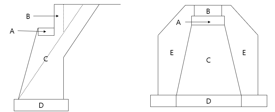 - 중력식 교대: 높이 4~6m까지, 자중이 크기 때문에 지지 지반이 야옿한 곳에 사용