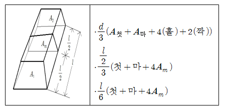 : 철도, 수로, 도로 등 선상의 물체를 축조하고자 할 경우 중심 말뚝과 중심 말뚝 사이의 횡단 면사이의 절토량 또는 성토량을 계산할 경우에 이용되는 방법
