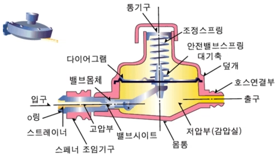 - 기능: 유출압력 조절로 안정된 연소를 도모하고, 소비가 중단되면 가스를 차단한다.