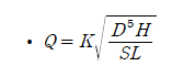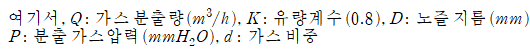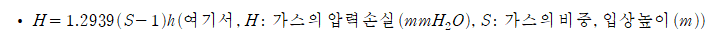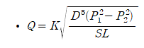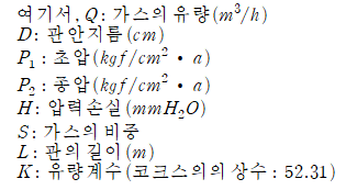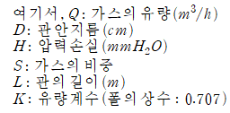 - 관 안지름의 5승에 반비례한다.(지름이 1/2로 작아지면 압력손실은 32배이다.) - 가스 유량 공식