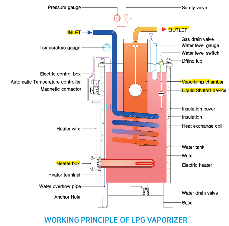 - 작동원리: INLET을 통해 유입된 액은 열교환용 코일을 통과하면서 히터에 의해 가열된 온수와 열 교환이 이루어지면서 기화된다. 기화된 가스는 기화통과 Gas Outlet을 통해 사용자측으로 공급된다. 물은 자동온도조절기에 의해 60~75℃를 유지하면서 액체를 지속적으로 기화시킨다. 기화양보다 사용양이 많은 경우 또는 어떤 원인에 의해 LPG 액이 기홭오 내부의 Float Ball을 상부로 밀어 올려 출구포트를 닫게되어 액유출이 방지된다. 액의 이상 압력은 안전밸브를 통해 배출시키고, 물 레벨이 적정 수위보다 낮은 경우 물레벨스위치에 의해 히터에 전원공급이 차단된다.