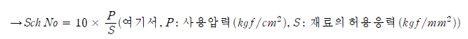 - 스케줄 번호(schedule number): 사용압력과 배관재료의 허용응력과의 비에 의하여 배관 두꼐의 체계를 표시한 것이다.