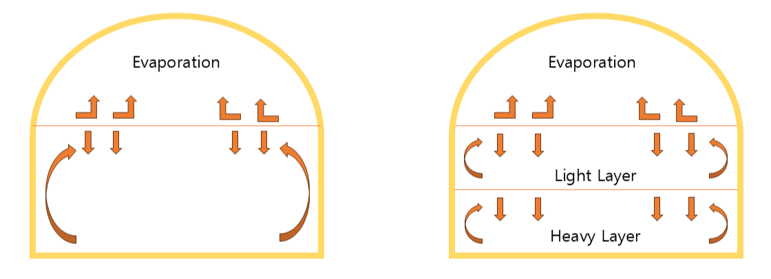 LNG는 단일 성분의 물질이 아니므로여러 성분의 조성에 따라 물성의 차이가 있으며 산지에 따라 차이가 나게 된다. 일반적으로는 물성의 차이가 있는 LNG를 저장하면 (그림1)과 같이, 자연대류 흐름과 증발의 과정을 통해 탱크 내에 이미 저장되어 있는 LNG와 자연스럽게 섞이면서, 균일한 온도 및 밀도의 물성으로 변하게 된다.