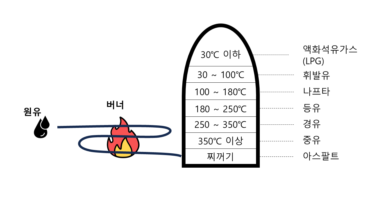 원유를 끓이면 증발돼 끊는점이 낮은 물질부터 차례대로 분리되는데, 이를 분별증류(Fractional distillation)라고 합니다. NCC(Naphtha Cracking Center)는 정제과정을 통해 나온 나프타를 고온에서 분해하여 석유화학 기초원료인 에틸렌(Ethylene), 프로필렌(Propylene), 부타디엔(Butadien) 등 기초유분을 생산하는 시설이다. 분해, 급랭, 압축, 분리정제 공정을 거치면 우리가 알고 있는 PE, PP, ABS 등의 플라스틱 원료로 분리된다.