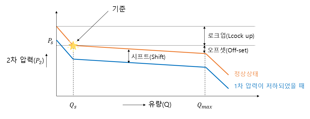 - 로크업(Lock uo): 유량이 0으로 되었을 때 2차 압력과 기준압력(Ps)과의 관계
