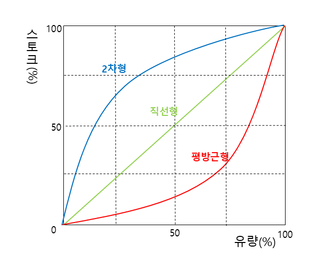 - 유량특성: 메인 밸브의 열림과 유량의 관계