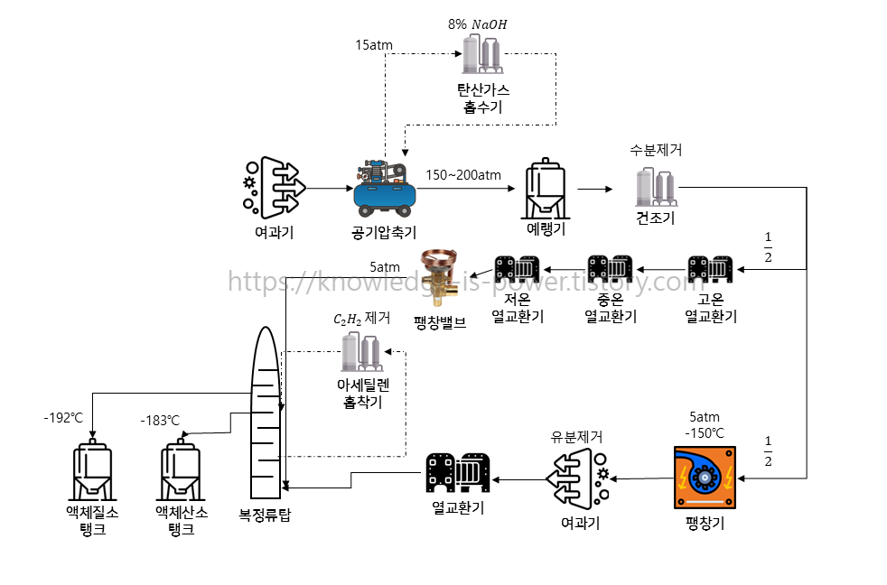 - 이 액화질소와 약화공기는 상부탑에 이송되며, 이때 아세틸렌 흡착기에서 액체공기 중의 아세틸렌 기타 탄화수소가 흡착·제거된다.