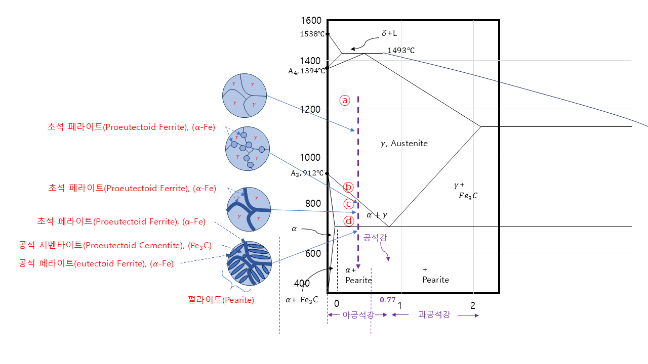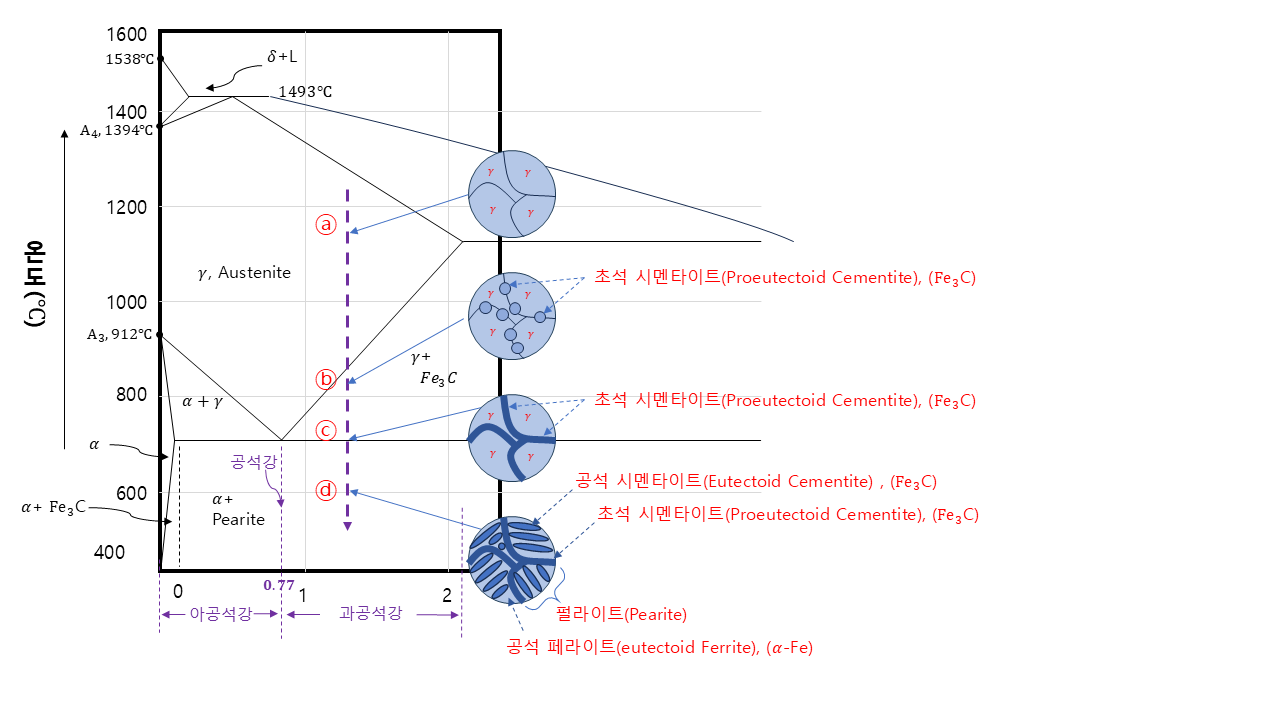 - 계속 냉각하여 d점을 통과하면 오스테나이트 조직의 탄소함량은 0.77%로 증가하여 공석반응을 일으키며 공석반응이 나타나 펄라이트 조직으로 변태한다.