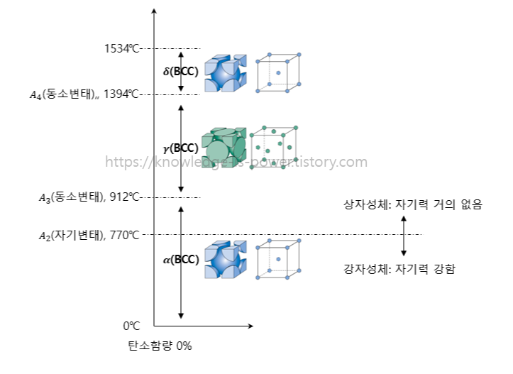 - 동소변태: 순철의 온도가 올라가면서 내부 결정구조가 바뀌는 것, 0℃ ~912℃의 온도의 철을 알파-철이라하고, BCC 구조를 갖는다. 912℃~1400℃의 온도에서는 감마-철이라하고, FCC구조로 바뀌고, 1400℃~1592℃ 온도 사이에서는 델타-철 BCC로 격자구조가 바뀐다.