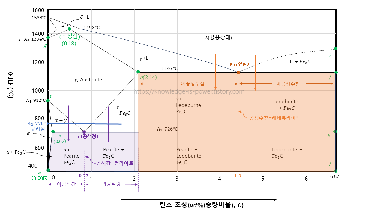 - h점(공정점): h점 위 영역은 용융 상태의 철이다. 그때의 온도가 1147℃, 고용률은 4.3%이다. 공정반응이란 액체가 고체와 고체로 나누어지는 반응을 말한다. 즉, 이 점위의 용융된 철을 냉각하여 h점을 지나게 되면 오스테나이트와 시멘타이트가 동시에 석출하게 된다.