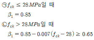 ③계수 배타1은 fck≤28MPa에서는 0.85이고 28MPa을 초과할 경우 매 1MPa의 강도에 대하여 베타1의 값을 0.007씩 감소시킨다. 그러나 그 값은 0.65보다 작지 않게 한다.