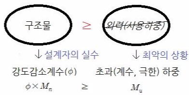 (M_d: 설계강도, phi: 시공오차, M_n: 공칭강도, M_u:극한강도, 계수, 소요강도)