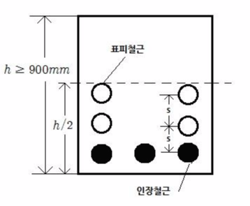 (여기서, 표피철근은 900mm이상 보의 중간 부분에 발생할 수 있는 균열을 방지하기 위해 콘크리트 인장부분에 배근한다.)