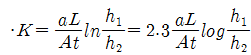 (여기서, A: 시료의 단면적(cm^2), t: 측정시간(sec, t2-t1), a: 스탠드 파이프의 단면적(cm^2), L: 시료의 길이(cm), h1: t1에서의 수위(cm), h2: t2에서의 수위)