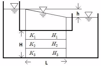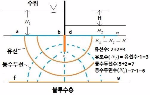 (여기서, q: 침투유량, H: 전수두차(상, 하류 수면의 수두차, Nd: 등수두면의 수, Nf: 유로수)