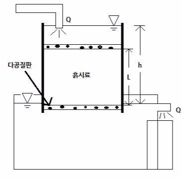 (여기서, Q: 침투수량(cm^3), L: 시료의 길이(cm), A: 시료의 단면적(cm^2), h: 수위차(cm), t: 측정시간(sec))