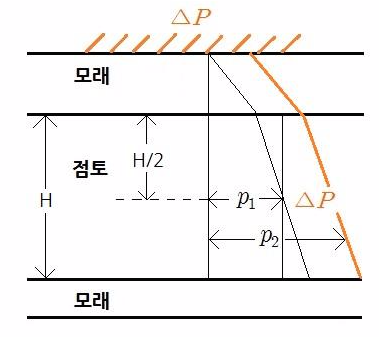 (여기서, H: 점토(압밀)층의 두께, p1: 초기 유효상재하중, p2=p1+델타p, 델타p: 하중증가량, C_c: 압축지수)