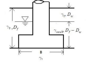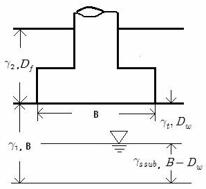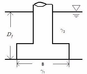 (여기서, alpha, beta : 기초 모양에 따른 형상계수(Shape factor), c: 기초바닥 아래 흙의 점착력(t/m^2), N_c, N_f, N_q: 지지력계수(내부마찰각 phi에 의해 결정됨), gamma_1: 기초바닥 아래 흙의 단위중량(t/m^3), B: 기초의 최소폭(m), gamma_2: 근입깊이 흙의 단위중량(t/m^3), D_f: 근입깊이(m))
